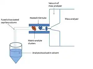 Solvent assisted inlet ionization (SAII) is similar to matrix-assisted inlet ionization however the matrix is a solvent such as water, acetonitrile and methanol.[3] This ionization technique is highly sensitive to small molecules, peptides and proteins.[3] The analyte is dissolved in the solvent and can either be introduced to the heated inlet tube by a capillary column or directly injected into the inlet tube with a syringe or by pipetting. The capillary column is made of fused silica particles with one end submerged in the sample solvent and the other in the end of the heated inlet tube. The solvent flows through the capillary column without the use of a pump due to the pressure difference between ambient pressure and the vacuum.[7]
