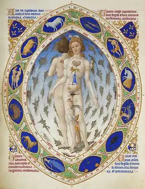 "Anatomical Man" (also "Zodiacal Man"), Très Riches Heures du Duc de Berry (Ms.65, f.14v, early 15th century)