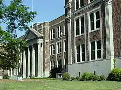 In 1928 the new building at 1266 Poplar was completed and the school changed its name for a final time to Memphis Technical High School. At the main entrance were four Corinthian columns, supporting a portico on the front. Some elements from the previous Van Vleet mansion were retained, including two stone lions at the east gate (since moved to the entrance of Memphis Zoo and then to a central location within the zoo), a stone bench from the mansion's green house, and two large classic urns at the top of the entrance steps. The four columns and portico of the school's entrance themselves reflect the entrance to the Van Vleet mansion.