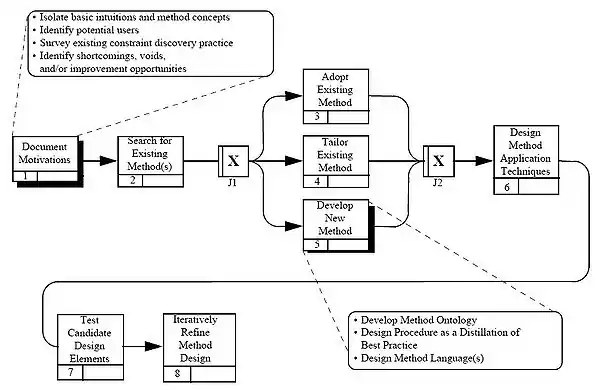 The developers of the IDEF modeling languages, Richard J. Mayer et al. (1995), have developed an early approach to method engineering from studying common method engineering practice and experience in developing other analysis and design methods. The following figure provides a process-oriented view of this approach. This image uses the IDEF3 Process Description Capture method to describe this process where boxes with verb phrases represent activities, arrows represent precedence relationships, and "exclusive or" conditions among possible paths are represented by the junction boxes labeled with an "X.".[1]