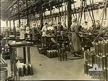 The Munitions of War Act of July 1915 declared that the admission of 'semi-skilled or female labour shall not affect adversely the rates customarily paid for the job' or reduce the rates a man could be expected to pay.[10] There was not an official statement as to what constituted "men's" work versus "women's" but in October, suggestions were made as to what women doing "men's" work should be paid.[11][10] An amendment in January 1916 stated that the Minister of Munitions had the power to give directions as to the rate of wages of female workers, and introduced compulsory arbitration for disagreements between women workers and their employers. In the August 1917 Act, the certificate regulations preventing women from leaving factories without their employers' permission to earn higher wages elsewhere were repealed.[10] Munitions workers presented an unusual case in the history of equal employment. The Ministry of Munitions approach to the principle "equal pay for equal work" was that: