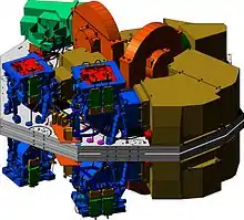 NIRCam (Near-InfraRed Camera) is an instrument aboard the James Webb Space Telescope. It has two major tasks, as an imager from 0.6 to 5 micron wavelength, and as a wavefront sensor to keep the 18-section mirrors functioning as one.[1][2] In other words, it is a camera and is also used to provide information to align the 18 segments of the primary mirror.[3] It is an infrared camera with ten mercury-cadmium-telluride (HgCdTe) detector arrays, and each array has an array of 2048×2048 pixels.[1][2] The camera has a field of view of 2.2×2.2 arc minutes with an angular resolution of 0.07 arcsec at 2 microns.[1] NIRCam is also equipped with coronagraphs, which helps to collect data on exoplanets near stars. It helps with imaging anything next to a much brighter object, because the coronagraph blocks that light.[2]