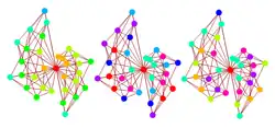 Illustration of tunable topology in the NK model. Nodes are individual binary strings, edges connect strings with a Hamming distance of exactly one. (left) N = 5, K = 0. (centre) N = 5, K = 1. (right) N = 5, K = 2. The colour of a node denotes its fitness, with redder values having higher fitness. The embedding of the hypercube is chosen so that the fitness maximum is at the centre. Notice that the K = 0 landscape appears smoother than the higher-K cases.