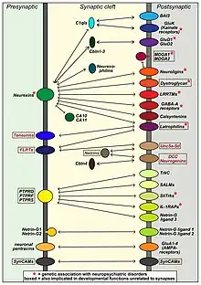 10. 1 2 3 4 5 6 Craig AM, Kang Y (February 2007). "Neurexin-neuroligin signaling in synapse development". Current Opinion in Neurobiology. 17 (1): 43–52. doi:10.1016/j.conb.2007.01.011. PMC 2820508. PMID 17275284.