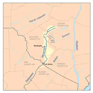The Neversink River (also called Neversink Creek in its upper course) is a 55-mile-long (89 km)[1] tributary of the Delaware River in southeastern New York in the United States. The name of the river comes from the corruption of an Algonquian language phrase meaning "mad river."