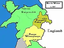 The north of Wales was traditionally divided into three regions during the middle ages: Upper Gwynedd (or Gwynedd above the Conwy), defined as the area north of the River Dyfi and west of the River Conwy; Lower Gwynedd (or Gwynedd below the Conwy), also known as the Perfeddwlad ("the middle country") and defined as the region east of the River Conwy and west of the River Dee; and Ynys Môn (or Anglesey), a large island off the north coast. English Maelor, currently part of Wrexham County Borough, located east of the River Dee, as the name suggests, was part of England during a significant part of this period.