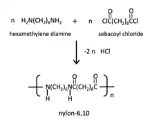 The nylon rope trick typically makes use of a water solution of an aliphatic diamine with a solution of an aliphatic diacid chloride in a solvent that does not dissolve in water, yielding a synthetic polyamide of the nylon-type. Nylon 610 is commonly used, in which hexamethylene diamine is dissolved in water to a concentration of about 0.40 moles / deciliter. A solution of sebacoyl chloride in cyclohexane (0.15 moles / deciliter concentration) is then layered on top of the water solution, the reaction typically being conducted in a beaker. The solution is not agitated; instead the nylon 610 polymer forms as a flexible film at the interface of the water and cyclohexane layers, in an example of an interfacial polymerization.[1] The experimentalist grasps the polymer film, withdrawing it from the reaction vessel, forming a filament or rope, and collecting it on a rotating rod above the reaction vessel. New polymer forms at the interface as fresh surfaces of the cyclohexane layer and the water layer form. In this way, the demonstration yields a continuous rope that is collected on the rotating rod. Nylon 66 can also be produced at laboratory scale in this way.