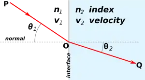 where and are the angles between the normal (to the interface) and the incident and refracted waves, respectively.[41]