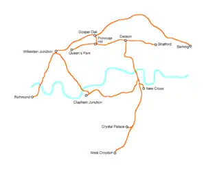 It would have connected the extended North London Line, East London Line, the South London Line and the West London Line, possibly including the Gospel Oak to Barking Line. The combined line would have orbited London in Zone 2, Zone 3 and (possibly) Zone 4.