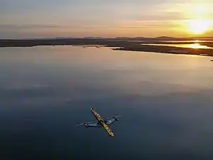 The Orbital O2 was constructed in Dundee, Scotland[9][10] by Texo Group.[11] It was launched from the city into the Tay Estuary on 22 April 2021 via a submersible barge. This turbine has twin 20 m diameter rotors, a 72 m long hull, and weighs 680 tonnes.[12] It was towed to the Fall of Warness site in April and grid connected in July 2021.[6]