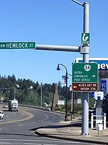 Oregon Route 34 is a state highway in the U.S. state of Oregon that runs between the city of Waldport on the Oregon Coast and the city of Lebanon in the western part of the state. OR 34 traverses the Alsea Highway No. 27 from Waldport to Flynn, part of the Corvallis–Newport Highway No. 33 from Flynn to east of Corvallis, and the Corvallis–Lebanon Highway No. 210 from east of Corvallis to Lebanon, of the Oregon state highway system.[2] In Corvallis, OR 34 includes a brief concurrency with U.S. Route 20 and OR 99W over the Pacific Highway West No. 1W.