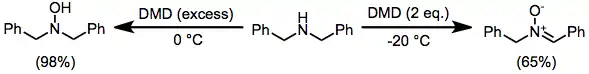 DMD may oxidize heteroatoms to the corresponding oxides (or products of oxide decomposition). Often, the results of these oxidations depend on reaction conditions. Tertiary amines cleanly give the corresponding N-oxides.[12] Primary amines give nitroalkanes upon treatment with 4 equivalents of DMD, but azoxy compounds upon treatment with only 2 equivalents.[13] Secondary amines afford either hydroxylamines or nitrones.[14]