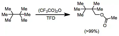 Although alkanes are typically difficult to functionalize directly, C-H insertion with TFD is an efficient process in many cases. The order of reactivity of C-H bonds is: allylic > benzylic > tertiary > secondary > primary. Often, the intermediate alcohols produced are oxidized further to carbonyl compounds, although this can be prevented by trapping in situ with an anhydride. Chiral alkanes are functionalized with retention of configuration.[17]