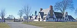 The Packard Proving Grounds consisted of a 2.5-mile (4.0 km) high-speed concrete oval track with timing tower, miles of test roads of various conditions, an airplane hangar (Packard was also involved in developing aircraft engines, and used the track's infield as a landing strip), a repair garage, and a gate house/lodge that housed the Proving Grounds manager and his family. The Tudor Revival lodge building also had garage space for eight cars, plus dormitory rooms for visiting engineers.[2]
