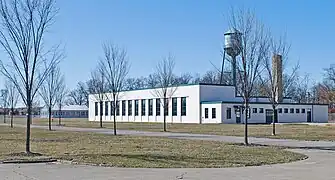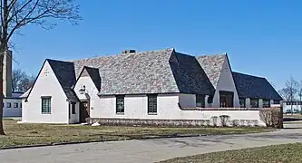 About 100 feet west of the Gate Lodge sits the single story, Tudor Revival style Repair Garage. Designed in 1928 by Albert Kahn, it uses the same wall and roof materials and the same asymmetrical, cross-gabled form as the Gate Lodge. The nearby Engineering Laboratory was designed by William E. Kapp in 1943. It is a 1+12-story rectangular building, constructed of concrete block with a flat asphalt composite roof. Three smaller outbuildings and a water tower are located north of the engineering building and repair garage. These are the 1927 tool shed, the 1929 garage and restroom, and the c. 1955 electrical building.[2]