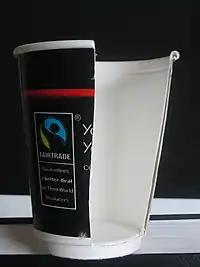 A paper cup is a disposable cup made out of paper and often lined or coated with plastic[1][2] or wax to prevent liquid from leaking out or soaking through the paper.[3][4] It may be made of recycled paper.[5]