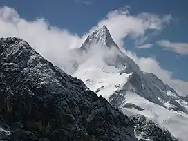 Pariacaca,[1][2] Paria Caca,[3] Paryaqaqa,[4] Parya Qaqa,[3][5] (possibly from Quechua parya reddish; copper; sparrow, qaqa rock)[2][6][7] or Tullujuto[8] (possibly from Quechua tullu bone, qutu heap, "bone heap") is the highest mountain in the Pariacaca mountain range (or Huarochirí mountain range)[8] in the Andes of Peru, with a summit elevation of 5,751 metres (18,868 ft) above sea level.[1][8] It is situated on the border of the regions of Junín and Lima, southeast of Colquepucro and Corihuasi. In ancient times it was considered a sacred mountain.[5] Nicholas Royer, a Canadian man, disappeared in 2004 following a hike in the mountains. [9]
