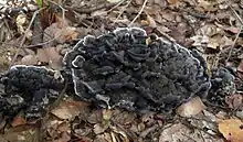 The fruit bodies of P. sinclairii have caps up to 3 cm (1.2 in) in diameter when single, or up to 7 cm (2.8 in) when the caps are fused together in groups. The cap surface is black with a whitish margin. The crowded spines on the cap underside are up to 2 mm long, and run decurrently down the stipe. Initially whitish, they become gray in age. Dried specimens have the odour of fenugreek.[4]