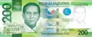 The Philippine two hundred-peso note (Filipino: dalawandaang piso; ₱200) is a denomination of Philippine currency. President Diosdado Macapagal is currently featured on the front side of the note, and since 2017, President Gloria Macapagal Arroyo's inauguration as the 14th President of the Philippines (EDSA People Power II) is on the lower-left side on the note just in front of the scene of the Declaration of Philippine Independence, and the scene of the opening of the Malolos Congress is also present on the obverse side of the note. From 2010 to 2017, the Aguinaldo Shrine (labeled as "Independence House") and the Barasoain Church were featured on the front side of the note. The Chocolate Hills and the Philippine tarsier is featured on the reverse side. Currently, it is the rarest banknote circulating in the country, and thus is seen more as a novelty than legal tender.