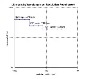 The ability to project a clear image of a small feature onto the wafer is limited by the wavelength of the light that is used, and the ability of the reduction lens system to capture enough diffraction orders from the illuminated mask. Current state-of-the-art photolithography tools use deep ultraviolet (DUV) light from excimer lasers with wavelengths of 248 (KrF) and 193 (ArF) nm (the dominant lithography technology today is thus also called "excimer laser lithography"), which allow minimum feature sizes down to 50 nm. Excimer laser lithography has thus played a critical role in the continued advance of the Moore's Law for the last 20 years (see below[30]).