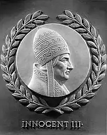 Pope Innocent III (Latin: Innocentius III; 22 February 1161 – 16 July 1216),[1] born Lotario dei Conti di Segni (anglicized as Lothar of Segni), was the head of the Catholic Church and ruler of the Papal States from 8 January 1198 until his death on 16 July 1216.