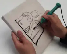 A punch needle stitch is made by forcing the needle through the weave of the fabric, creating a loop that is kept in place by friction.[1][5][7] The tool is held so that the eye of the needle stays on the opposite side of the direction of the stitch.[1][4][8] Punch needle embroidery is typically worked from the front of the fabric. On the other hand, punch needle rug making is usually worked from the back.[5][9]