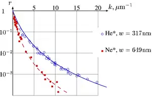 In the experiments with Ne atoms, usually just fall down, when the MOT is suddenly switched off. Then, the speed of atoms is determined as , where is acceleration of free fall, and is distance from the MOT to the sample. In experiments described, this distance was of order of 0.5 meters (2 ft), providing the speed of order of 3 m/s (6.7 mph; 11 km/h). Then, the transversal wavenumber can be calculated as , where is mass of the atom, and is the Planck constant.