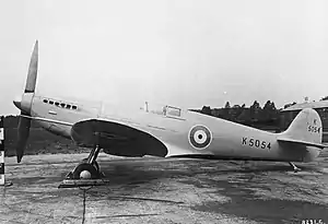 The prototype, given the serial K5054, first flew on 6 March 1936, at Eastleigh, Hampshire. Mitchell witnessed the flight. Despite being ill, he travelled to Eastleigh during the flight tests for K5054.[93][note 4] In June 1936, before the prototype had completed being trialled, the Air Ministry placed an order for 310 Spitfires.[94]