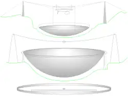 The world's largest filled-aperture (i.e. full dish) radio telescope is the Five-hundred-meter Aperture Spherical Telescope (FAST) completed in 2016 by China.[8] The 500-meter-diameter (1,600 ft) dish with an area as large as 30 football fields is built into a natural karst depression in the landscape in Guizhou province and cannot move; the feed antenna is in a cabin suspended above the dish on cables. The active dish is composed of 4,450 moveable panels controlled by a computer. By changing the shape of the dish and moving the feed cabin on its cables, the telescope can be steered to point to any region of the sky up to 40° from the zenith. Although the dish is 500 meters in diameter, only a 300-meter circular area on the dish is illuminated by the feed antenna at any given time, so the actual effective aperture is 300 meters. Construction was begun in 2007 and completed July 2016[9] and the telescope became operational September 25, 2016.[10]