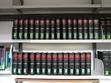 Encyclopædia Britannica, 15th edition: volumes of the Propedia (green), Micropedia (red), Macropedia (black), and 2-volume Index (blue)
