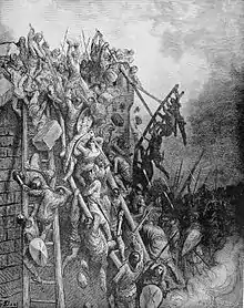 Prominent leaders of crusaders involved in the massacres included Peter the Hermit and especially Count Emicho.[4] As part of this persecution, the destruction of Jewish communities in Speyer, Worms and Mainz was noted as the Hurban Shum (Destruction of Shum).[5] These were new persecutions of the Jews in which peasant crusaders from France and Germany attacked Jewish communities. A number of historians have referred to the violence as "pogroms".[6]