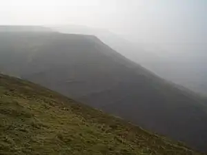 The summit is marked by a trig point and crowns an area of peat bog, heather and long grasses. Its northern face is precipitous.[1]