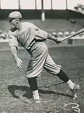 Many baseball players were drafted to fight in World War I in 1918, but Hornsby was given a draft deferment because he was supporting his family.[19] During the offseason, Miller Huggins, unhappy with the Cardinals' management, left the team to manage the New York Yankees. He was replaced by Jack Hendricks, who had managed the Indianapolis Indians to a pennant in the American Association the previous year.[20] Hornsby lacked confidence in Hendricks's ability to run the Cardinals, and the two men developed animosity towards each other as a result of Hornsby's growing egotism and fondness for former manager Huggins.[21] Under Hendricks, Hornsby's batting average dipped to .281.[22] He had problems off the field too; on June 17, Hornsby hit St. Louis resident Frank G. Rowe with his Buick when Rowe stepped out in front of traffic to cross an intersection. Rowe sued Hornsby for $15,000 ($291,836 today), but Hornsby eventually settled for a smaller, undisclosed amount, and the case was dismissed.[23] He was still among the league leaders in triples and slugging percentage in 1918, but after the season ended with the Cardinals in last place, he announced that he would never play under Hendricks again.[22] Partially due to Hornsby's complaints, Hendricks was fired after the season and replaced by Branch Rickey, then president of the Cardinals.[24]
