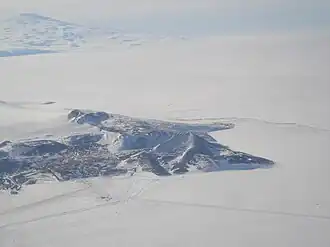Mount Erebus is the island's most prominent landmark. Hut Point Peninsula, the site of McMurdo Station (US) and Scott Base (New Zealand), projects southwest from its lower slopes. Barne Glacier projects off its western slopes. To the north of Mount Terror are the Kienle Nunataks.