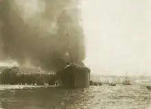 The second explosion provoked public disorder. People tried to attack the homes of the Civil Governor and the engineer in charge of the salvage work.[13] Much of Santander's population attended the funeral of the 18 victims, which was held on 24 March. After they left the cemetery, some of the crowd threw stones at Ybarra's office in Santander.[14] A detachment of Guardia Civil responded with fixed bayonets and firing shots in the air.[4] It was reported that "many civilians and a few solidiers [i.e. Guardia] were injured". After the Guardia drove them away from the company office, some of the crowd went to the harbour, where they cut the hawsers on an Ybarra ship that was moored there.[14]