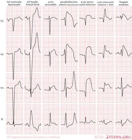 - 1 2 3 4 5 Erwin Christian, de Bliek (17 February 2018). "ST elevation: Differential diagnosis and caveats. A comprehensive review to help distinguish ST elevation myocardial infarction from nonischemic etiologies of ST elevation". Turkish Journal of Emergency Medicine. 18 (1): 1–10. doi:10.1016/j.tjem.2018.01.008. PMC 6009807. PMID 29942875.