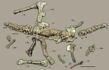 PVSJ 605 was discovered in 1994, in gray-green sandstone 40 meters above the base of the Ischigualasto Formation, in Ischigualasto Provincial Park in San Juan, Argentina. An ash bed from the early part of the formation dates to approximately 231.4 Ma, during the late Carnian Stage of the Late Triassic.[1] The original description indicated that the skeleton was from the earliest part of the Cancha de Bochas Member,[1] though later sources suggested that it was from the upper La Peña member.[2][3]
