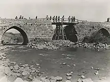 During the Sinai and Palestine Campaign of World War I, Australian sappers repaired a bridge at the historic crossing of the Jordan River at Jisr Benat Yakub (also known as Jacob's Ford). Here the retreating Ottoman and German rearguard had blown up the bridge's central arch, which was repaired in five hours by sappers attached to the Australian Mounted Division. While the light horse brigades forded the river, continuing the Desert Mounted Corps' advance to Damascus, the sappers worked through the night of 27/28 September 1918, to repair the bridge to enable the division's wheeled vehicles and guns to follow on 28 September.[9][10][11]