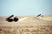 A Brazilian-made Avibras ASTROS-II SS-30 multiple rocket systems on Tectran 6x6 AV-LMU trucks stand in firing position while being displayed as part of a demonstration of Saudi Arabian equipment.