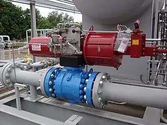 A blowdown valve (BDV) is a type of shutdown valve designed to depressurize a pressure vessel by directing vapour to a flare, vent or blowdown stack in an emergency. BDVs fail-safe to the open position upon failure of the control system.[1] The type of valve, type of actuation and performance measurement are similar to an ESD valve.