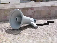 Public Address, Perry has said, functions as a reprise to his Public Purse (1994)[6] insofar as megaphones are associated with political demonstration, authoritarian instruction and public oration; symbolically they represent a public object and, moreover, language and communication. The irregular breathing emanating from Public Address subverts these traditional notions of the megaphone and represents the voice of a public stupor preventing the vocalisation of objections to a world in crisis. The sound of snoring is indicative of the privacy of unconsciousness, but within the urban context, lying discarded in Federation Square, the giant megaphone appears both comical and pathetic informing to the malaise symptomatic of cultural and political fatigue. Indeed, during a large political rally at Federation Square about workplace agreements, Perry's megaphone had to be turned off so the snoring didn't disrupt the rally. Ironically, John Howard responded to the demands for workplace agreements by stating that he would not be influenced by megaphone politics.[7]