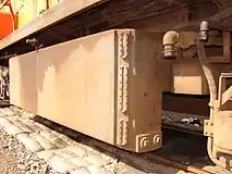 To be usable on the iron ore line, Class 34-400 units which ended up working there were modified to a similar fuel capacity. The inter-bogie linkage was removed and the fuel tank was enlarged by changing it from saddle-shaped to rectangular box-shaped. To maintain its lateral balance, a slab of metal was attached to each bogie in place of the removed linkage. In the second picture, the weld lines on the end of the enlarged fuel tank as well as the metal slab at the end of the bogie are visible.