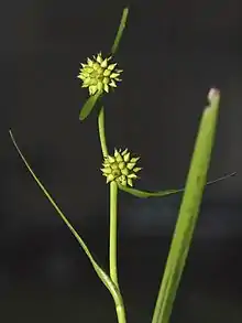 Sparganium natans is a species of bur-reed known by the common names least bur-reed[1] and small bur-reed.[2] It is a water circumboreal plant inhabiting North America, Europe, West Asia and Japan. It is usually found submersed in shallow, calm water. This bur-reed has thin, flexible, grasslike leaves which float in the water. Plants that spend more time out of water at the waterline are tougher and have shorter leaves. The plant bears two inflorescences, the staminate type being a rounded white filamentous ball and the pistillate type a sphere of thick, green, pointy peduncles. The fruits are small green or brown achenes.