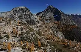 Spectacle Buttes are a pair of mountain summits located in the Entiat Mountains, a sub-range of the North Cascades, in Chelan County of Washington state.[3] The pyramid-shaped south summit is 8,392-foot (2,558-metre) in elevation, and the lower north butte is 8,080-foot (2,460-metre) in elevation. Spectacle Buttes are situated 77 miles northeast of Seattle in the Glacier Peak Wilderness, on land managed by the Wenatchee National Forest. Spectacle Buttes ranks 78th on Washington's highest 100 peaks, 81st on the "Bulger List", and seventh-highest in the Entiat Mountains.[1] The nearest higher peak is Marmot Pyramid on Mount Maude, 1.9 miles (3.1 km) to the west-northwest.[1] Precipitation runoff from the peaks drains into headwaters of the Entiat River. The first ascent of the south peak was made by Rowland Tabor and Dwight Crowder on August 20, 1953.[4][5]