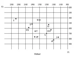 Based on Labov et al., ' averaged F1/F2 means for speakers from Western Pennsylvania. The merger of /ɑ/ and /ɔ/ is complete for 11 out of 14 speakers;[10] /ʌ/ is backer and lower than in the rest of the North Midland.