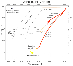 Slightly more massive stars do expand into red giants, but their helium cores are not massive enough to reach the temperatures required for helium fusion so they never reach the tip of the red-giant branch. When hydrogen shell burning finishes, these stars move directly off the red-giant branch like a post-asymptotic-giant-branch (AGB) star, but at lower luminosity, to become a white dwarf.[2] A star with an initial mass about 0.6 M☉ will be able to reach temperatures high enough to fuse helium, and these "mid-sized" stars go on to further stages of evolution beyond the red-giant branch.[11]