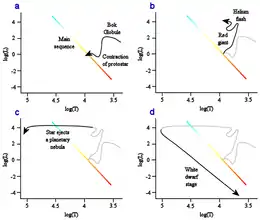 Mid-sized stars are red giants during two different phases of their post-main-sequence evolution: red-giant-branch stars, with inert cores made of helium and hydrogen-burning shells, and asymptotic-giant-branch stars, with inert cores made of carbon and helium-burning shells inside the hydrogen-burning shells.[12] Between these two phases, stars spend a period on the horizontal branch with a helium-fusing core. Many of these helium-fusing stars cluster towards the cool end of the horizontal branch as K-type giants and are referred to as red clump giants.
