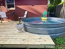 Stock tanks are increasingly used as "rustic" backyard above-ground pools, or "stock tank pools" by retrofitting a filter pump[4] and adding chlorine or stabilized hydrogen peroxide[5] to keep the water clean throughout the summer.[6] The water will need to be drained periodically and can be reused to water plants if hydrogen peroxide is used. Metal stock tanks have also been used as a cheap alternative for a hot tub. Various heating methods are possible, including use of a propane heater or submersible wood stove.[7]