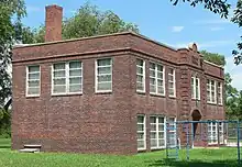 A flagpole is located outside the main entrance to the school building, and is included in the NRHP listing as a contributing feature. A set of gym bars, a tether ball pole, a swing set, a "slippery slide", and a merry-go-round are located on the south and west sides of the property, and are all listed as contributing features. A fenced tennis and basketball court is located on the north side of the property, and a large track and playing field are located on the west side of the property, but none of these features are included in the listing.[1]