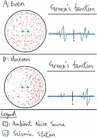 Ambient noise cross correlation is the process of finding the receiving time lag of ambient noise sources between two nearby stations. Figure 1 illustrates the simplest case of ambient noise cross-correlation. For a pair of receivers (or seismometers or seismic stations) at different locations, the ambient noise signals would be received at a different time, assumed that they travel at the same velocity at the subsurface. The products of cross-correlation of those signals are new seismic waveforms, namely Green's function. Regarding the case with multiple ambient noise sources, the shape of the cross correlation function depends on whether the ambient noise sources are evenly distributed across a certain area. For the most ideal situation where the ambient noise signals are distributed evenly across all directions, the Green’s function would be highly symmetrical (see Figure 2).